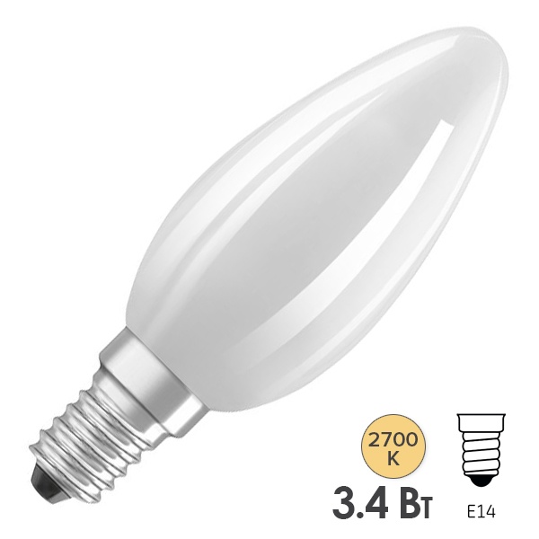 Филаментная, диммируемая лампочка формы свеча с нитевидными светодиодами, мощностью 3,4 Ватта, с цоколем E14 (миньон), теплый свет, матовая колба 4058075602779