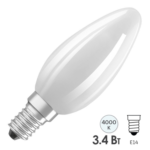 Филаментная, диммируемая лампочка формы свеча с нитевидными светодиодами, мощностью 3,4 Ватта, с цоколем E14 (миньон), нейтральный белый свет, матовая колба 4058075602793