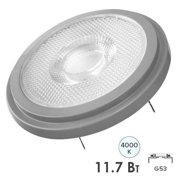 Лампа диммируемая светодиодная OSRAM PARATHOM PRO AR111, 800лм, 11,7Вт (замена 75 Вт), 4000К (нейтральный белый свет). Цоколь G53,колба AR111, угол пучка 24°. Исполнение колбы дымчатое, стекло. Напряжение питания 12В. Товар сертифицирован