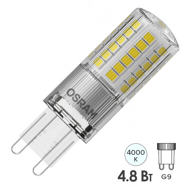 Лампа светодиодная OSRAM Parathom PIN, 600лм, 4,8Вт (замена 50 Вт), 4000К (нейтральный белый свет). Цоколь G9,колба PIN, угол пучка 320°. Исполнение колбы прозрачное, пластик. Напряжение питания 220-240В. Товар сертифицирован