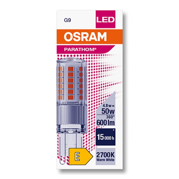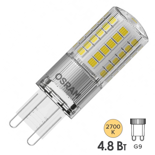 Лампа светодиодная OSRAM Parathom PIN, 600лм, 4,8Вт (замена 50 Вт), 2700К (теплый белый свет). Цоколь G9,колба PIN, угол пучка 320°. Исполнение колбы прозрачное, пластик. Напряжение питания 220-240В. Товар сертифицирован