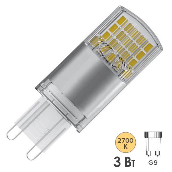 Лампа диммируемая светодиодная OSRAM Parathom PIN, 320лм, 3Вт (замена 30 Вт), 2700К (теплый белый свет). Цоколь G9,колба PIN, угол пучка 300°. Исполнение колбы прозрачное, пластик. Напряжение питания 220-240В. Товар сертифицирован