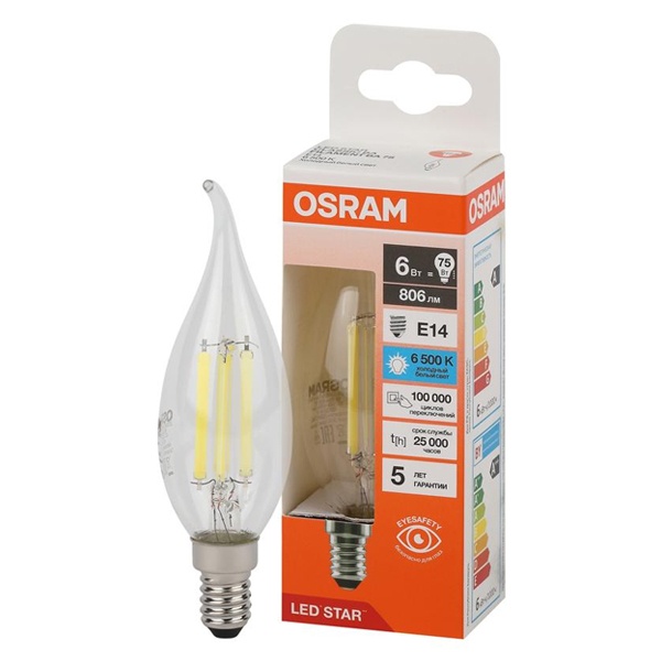 Лампа светодиодная филаментная OSRAM LED Star, 806лм, 6Вт (замена 75Вт), 6500К (холодный белый свет). Цоколь E14, колба BA, угол пучка 300°. Исполнение колбы прозрачное, стекло. Напряжение питания 220-240В. Особенности: гарантия 5 лет. Товар сертифицирован.