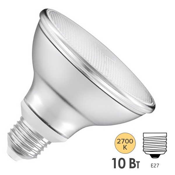 Лампа диммируемая светодиодная OSRAM Parathom PAR30, 633лм, 10Вт (замена 75Вт), 2700К (теплый белый свет). Цоколь E27, колба PAR30, угол пучка 36°. Исполнение колбы прозрачное, стекло. Напряжение питания 220-240В. Товар сертифицирован.