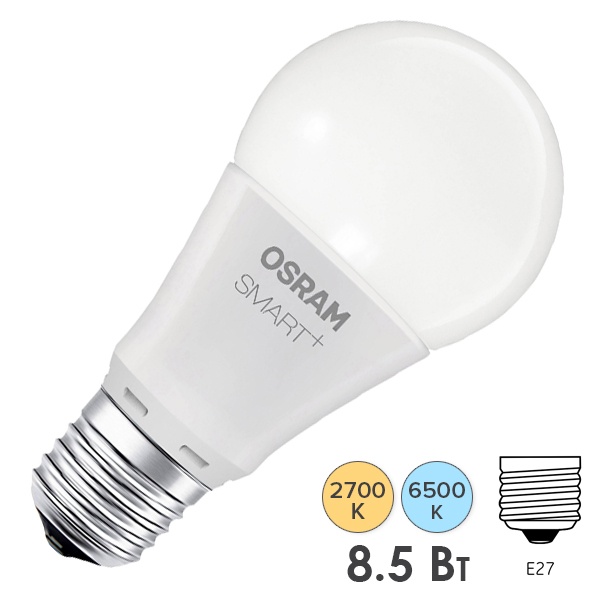 Светодиодная, диммируемая Смарт лампа груша Ледванс, с изменением цветовой температуры (от теплого 2700К до холодного белого 6500К.), мощностью 8,5 Ватт, с цоколем E27, матовая колба 4058075816534