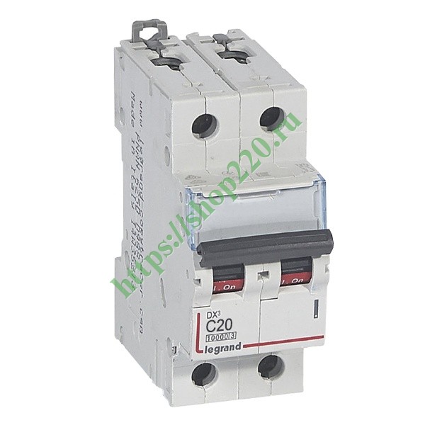 Двухполюсный модульный автоматический выключатель DX3 10000, 16кА, характеристика С, 20 Aмпер Legrand 409203