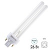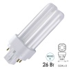 Компактная люминесцентная лампа неинтегрированная OSRAM DULUX D/E 26Вт с штырьковым одиночным четырехконтактным цоколем G24Q-2 и двухоборотными колбами. Лицензиатом торговой марки OSRAM в общем освещении является компания LEDVANCE.