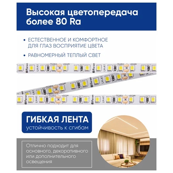 Высокая энергоэффективность 100 Лм/Вт позволяет использовать ленту не только в качестве декоративной подсветки, но и для основного освещения.