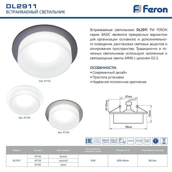 Светильник потолочный встраиваемый (ИВО) FERON DL2911, под лампу MR16 G5.3, белый, круг, 98*98*45 мм, монтажный диаметр 67мм, корпус металл+акрил, неповоротный