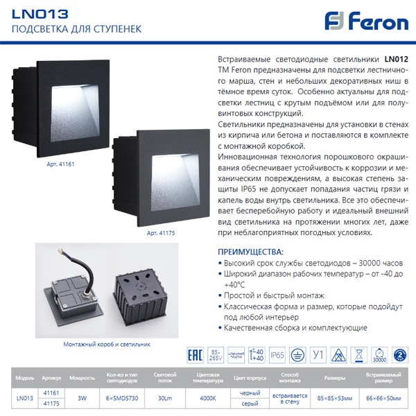 Встраиваемые светодиодные светильники LN013 TM Feron предназначены для подсветки лестничного марша, стен и небольших декоративных ниш в тёмное время суток. Особенно актуальны для подсветки лестниц с крутым подъемом или для полувинтовых конструкций.