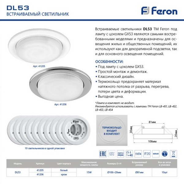 Светильник потолочный встраиваемый (ФВО) FERON DL53, под лампу GX53 GX53, хром, круг, 106*106*20 мм, монтажный диаметр 81мм, корпус металл, неповоротный
