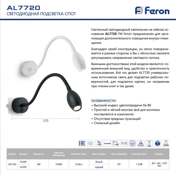 Настенный светодиодный светильник на гибком основании AL7720 TM Feron предназначен для организации дополнительного освещения внутри помещения. Благодаря своей конструкции, он легко поворачи-вается в разные стороны и Вы с лёгкостью сможете регулировать направление светового потока. Важными достоинствами этой модели являются: современный внешний вид, удобство и практичность использования. Всё это делает AL7730 универсальным источником света для подсветки рабочих поверхностей, для подсветки картин, он незаменим при чтении книг и так далее.