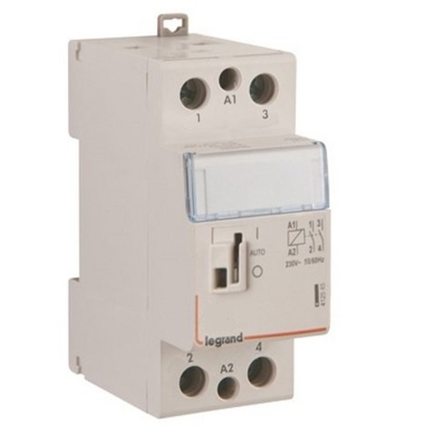 Модульный контактор серии CX3 от известной компании Legrand представляет собой коммутационный прибор с ручным управлением. С его помощью осуществляется коммутация различных электрических устройств: электронагревательных приборов, мощных двигателей, силового оборудования, уличного освещения и водонагревательных приборов. Особенность этой модели состоит в том, что изменение коммутационного положения можно производить вручную принудительным способом. В этом возникает необходимость во время ремонта или проверки оборудования. Положение рукоятки в режиме включено или отключено исключает возможность дистанционного управления. Допустимое напряжения на катушке управления 230 Вольт, ток нагрузки до 40 Ампер при предельном напряжении электроцепи переменного тока 250 Вольт. Двухполюсный контактор имеет ширину 2 модуля. Его корпус выполнен из термостойкого ударопрочного пластика. Монтаж прибора осуществляется на ДИН-рейку шириной 35 мм или монтажную рейку EN 60.715. При этом рабочее положение устройства может быть абсолютно любым.