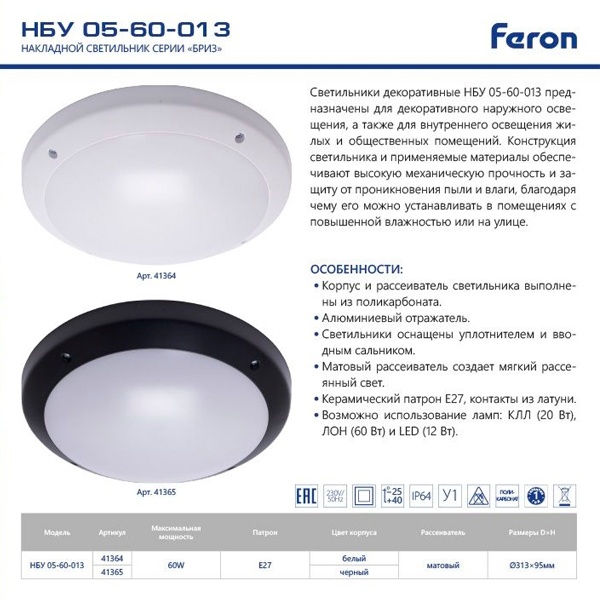 Светильники декоративные ФБУ 05-60-013 предназначены для декоративного наружного освещения, а также для внутреннего освещения жилых и общественных помещений. Конструкция светильника и применяемые материалы обеспечивают высокую механическую прочность и защиту от проникновения пыли и влаги, благодаря чему его можно устанавливать в помещениях с повышенной влажностью или на улице.