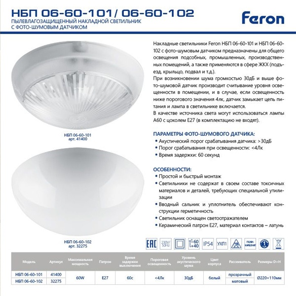 Накладные светильники Feron НБП 06-60-101 и НБП 06-60-102 с фото-шумовым датчиком предназначены для общего освещения подсобных, промышленных, производственных помещений, а также применяются в сфере ЖКХ (подъезд, крыльцо, подвал и т.д.). При возникновении шума громкостью 30дБ и выше фото-шумовой датчик производит считывание уровня освещенности в помещении, и в случае, если освещенность ниже порогового значения 4лк, датчик замыкает цепь питания и лампа в светильнике включается. В качестве источника света могут использоваться лампы А60 с цоколем Е27 (в комплектацию не входят).