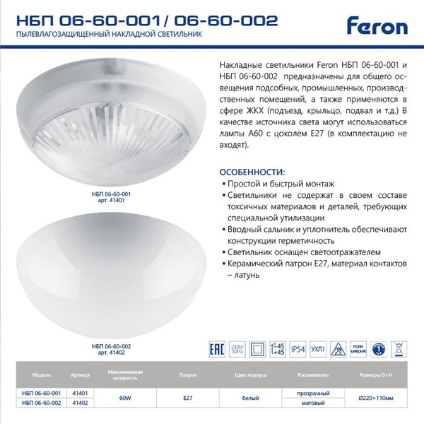 Накладные светильники Feron НБП 06-60-001 и НБП 06-60-002 предназначены для общего освещения подсобных, промышленных, производственных помещений, а также применяются в сфере ЖКХ (подъезд, крыльцо, подвал и т.д.) В качестве источника света могут использоваться лампы А60 с цоколем Е27 (в комплектацию не входят).