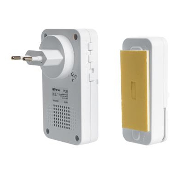 Звонок электрический дверной беспроводной FERON DB-100, 18 мелодий, цвет белый, регулировка громкости - есть, шифрование сигнала - есть; 107*58*70 мм, КНОПКА: IP44, раб.t -20..+60С , размер кнопки 37*22*94мм