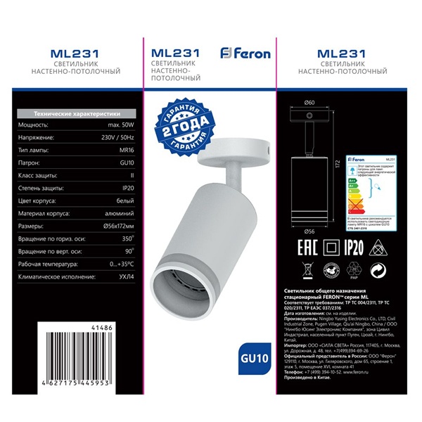 Белый поворотный накладной спот Ферон ML231 под лампу GU10, напряжением 230 Вольт мощностью 50 Ватт 41486