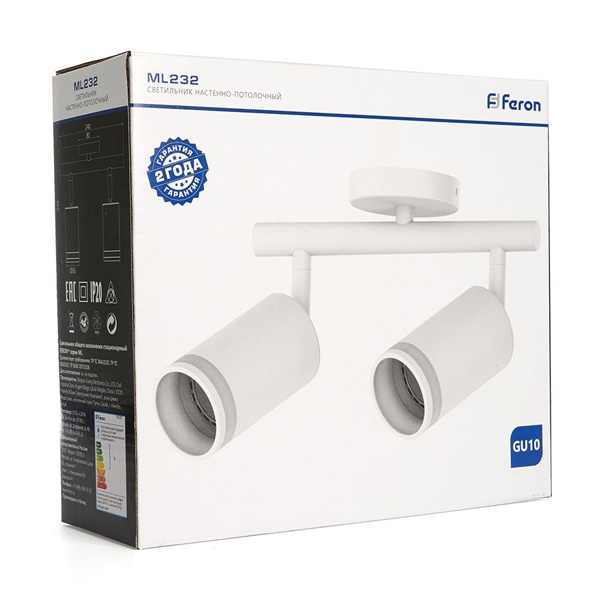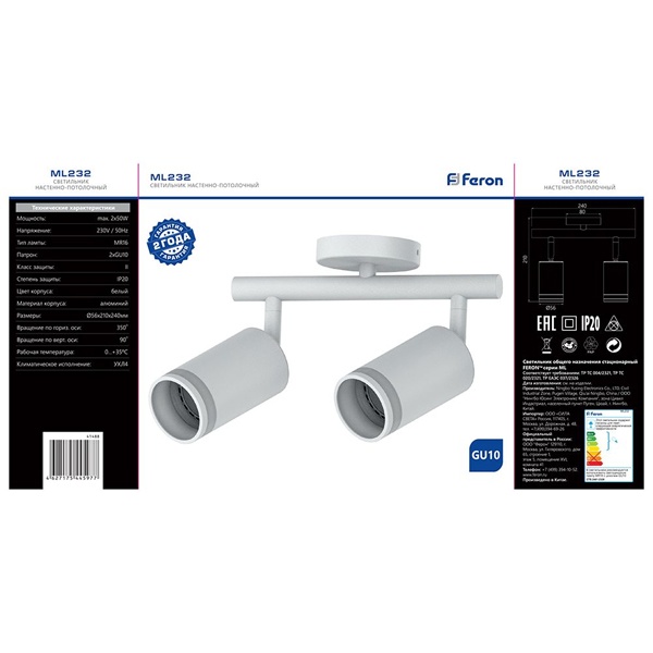 Белый поворотный накладной спот Ферон ML232 под лампу 2*GU10, напряжением 230 Вольт мощностью 2*50 Ватт 41488