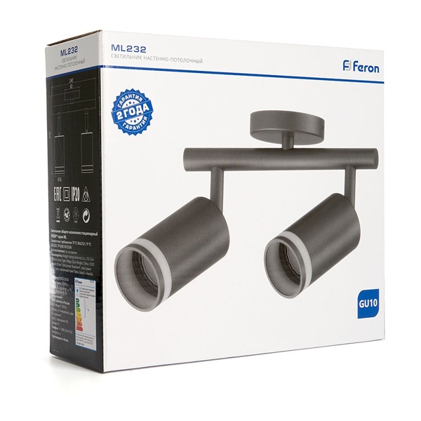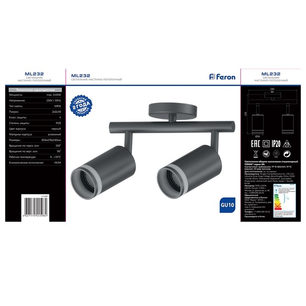 Светильник накладной под лампу, (ИВО) FERON ML232, 2*GU10 2*50W, 230V, IP20, цвет черный, корпус алюминий, акрил, 240*56*210