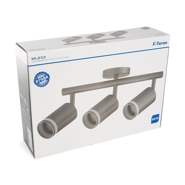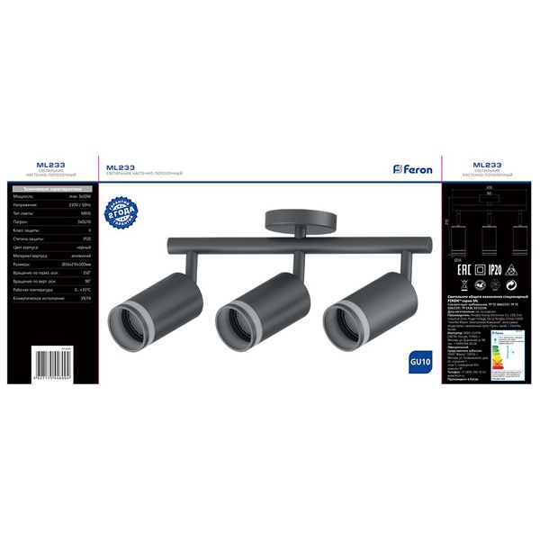 Светильник накладной под лампу, (ИВО) FERON ML233, 3*GU10 3*50W, 230V, IP20, цвет черный, корпус алюминий, 300*56*210