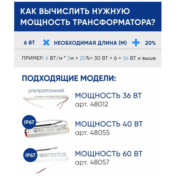 Подключение светодиодной ленты осуществляется через блок питания постоянного тока на напряжение 24В (не входит в комплект поставки).