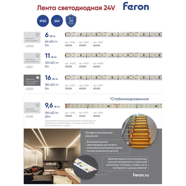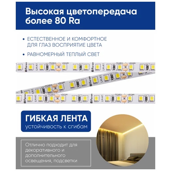Светодиодная лента TM «Feron» предназначена для декоративной подсветки внутри помещений, создания статических и светодинамических эффектов.