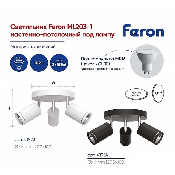Светильник накладной под лампу, (ИВО) FERON ML203-1, GU10 3*50W, 230V, IP20, цвет черный, корпус алюминий, 200*200*100
