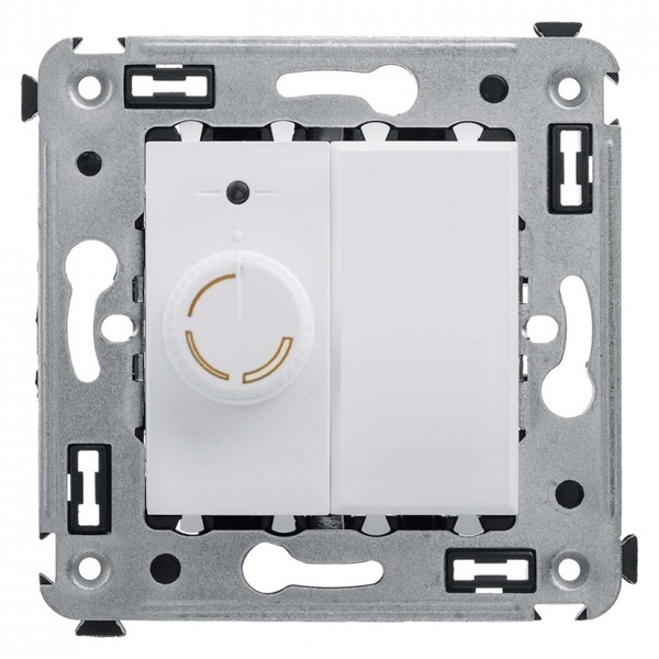 Диммеры предназначены для управления контуром освещения и регулировки интенсивности освещения помещения. Поворотный диммер – это колесико, поворот которого позволяет менять яркость комнатного освещения. Диммеры от ДКС применяются для скрытой установки в стену. Пластиковые части электро установочного изделия имеют оттенок "Белое облако" – светлый, спокойный оттенок, оттеняющий более насыщенные цвета, сочетающийся с интерьерами в любом стиле и любой цветовой гамме.