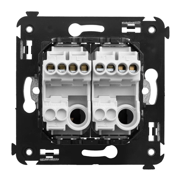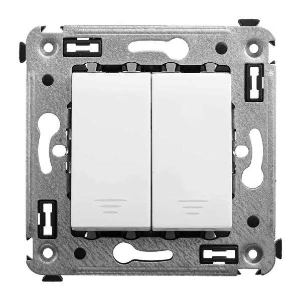 Кнопка двухклавишная. Назначение: для монтажа в подрозеточные коробки глубиной не менее 45 мм . Используется в качестве кратковременного включения источника питания энергией. Фиксация в подрозеточные коробки при помощи каркаса с лапками и саморезов.