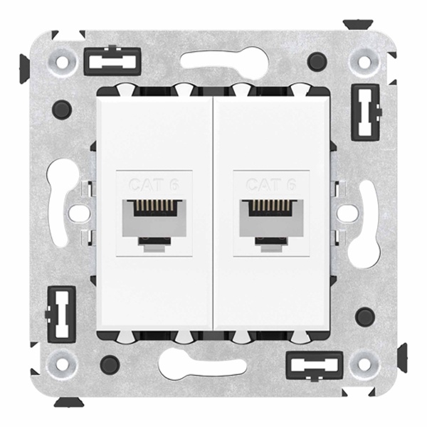 Компьютерная розетка двойная используется для подключения компьютерной техники и соединения с патч-панелью. Компьютерная розетка предназначена для скрытого монтажа в стену. Розетка RJ-45 категории 6 – это наиболее популярная на сегодняшний день модель. Она позволяет организовать сеть со скоростью до 1000 Мбит/с. Материал – металл, термопласт. Пластиковые части изделия выполнены в цвете "Белое облако" – самом универсальном оттенке из цветовой гаммы ЭУИ "Avanti". Спокойный и сдержанный, в интерьере этот оттенок создает атмосферу покоя и уюта.