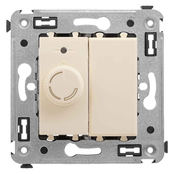 Диммеры предназначены для управления контуром освещения и регулировки интенсивности освещения помещения. Поворотный диммер – это колесико, поворот которого позволяет менять яркость комнатного освещения. Диммеры от ДКС применяются для скрытой установки в стену. Пластиковые части электро установочного изделия имеют оттенок "Ванильная дымка" – светлый, спокойный оттенок, оттеняющий более насыщенные цвета, сочетающийся с интерьерами в любом стиле и любой цветовой гамме.