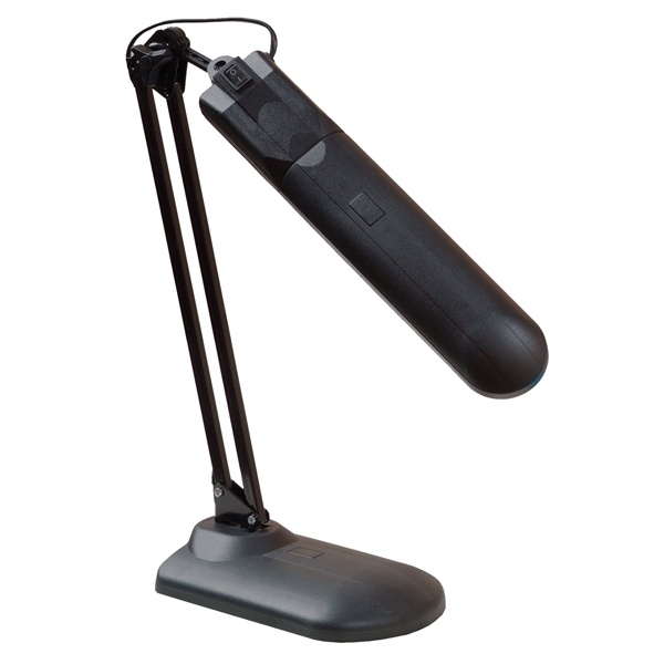 Настольный осветительный прибор с овальным плафоном вытянутой формы и полукруглой подставкой, из пластика, черного цвета. С гибкой штангой и регулируемым углом наклона плафона.Предусмотрен встроенный электронный пускорегулирующий аппарат (ЭПРА).