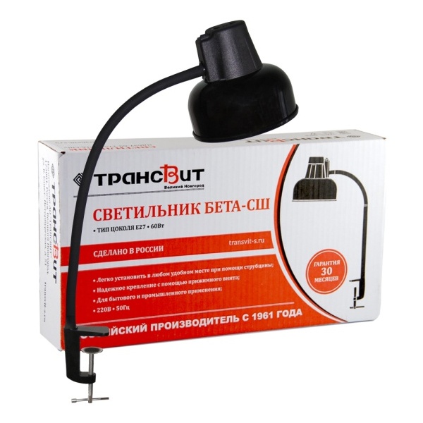 Настольный светильник Бета-Ш под лампу мощностью 60 Ватт с цоколем E27, на струбцине, гибкая стойка 450 мм, черного цвета 4607053883381