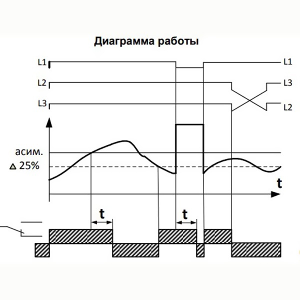 Регулируемый порог контроля асимметрии фаз 5%...25%Фиксированный порог срабатывания при превышении напряжения 1.3 UномКонтроль порядка чередования фазКонтроль обрыва фазКонтроль "слипания" фазРегулируемая задержка срабатывания 0.1.. 10сКонтроль напряжения рекуперации до 95%Не требует дополнительного напряжения питанияРеле асимметрии фаз РКФ-М06-12-15 (далее реле) предназначено для контроля трёхфазного напряжения в трёхпроводных сетях без нейтрали. Реле контролирует порядок чередования фаз, обрыв фаз,"слипание" фаз, недопустимую асимметрию (разбаланс) линейных напряжений, перенапряжения.