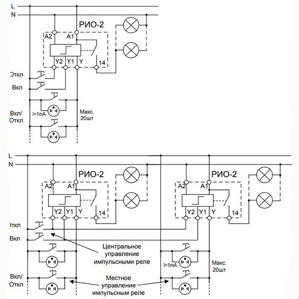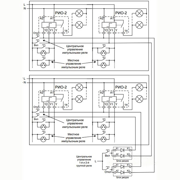 Реле импульсное освещения РИО-2 (далее - реле) предназначено для дистанционного управления освещением вкоридоре, на лестнице, этаже и т.п. с помощью параллельно соединённых кнопок с подсветкой. Дополнительные входыуправления позволяют централизованно включать или выключать свет во всем доме, в зависимости от установленногорежима работы организовывать различные схемы управления освещением. Использование блока диодов МД-3 позволяетформировать многоуровневые схемы управления освещением.
