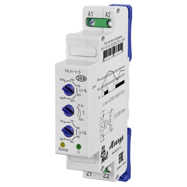 Однофазное реле контроля напряжения Меандр РКН-1-5-15 AC230В УХЛ4, оптронный выход — устройство для автоматического контроля параметров сети 230 В и защиты подключенного оборудования от недопустимых отклонений напряжения. Реле отслеживает уровень напряжения в однофазной сети и при выходе за установленные пределы формирует сигнал на выходе, отключая или блокируя нагрузку через внешнее исполнительное устройство (контактор, пускатель, реле промежуточное, вход контроллера).