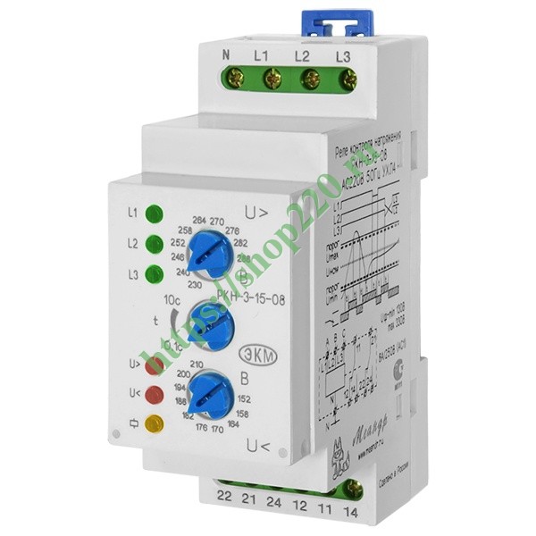 Реле контроля напряжения РКН-3-15-08 используется для контроля наличия, «слипания» и порядка чередования фаз в цепях трёхфазного напряжения в сетях с нейтралью, а также для контроля снижения и превышения напряжения ниже и выше установленного порога.