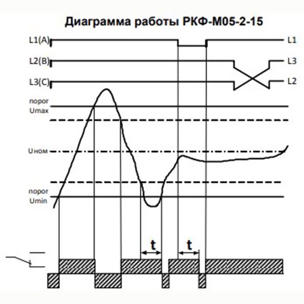 Реле контроля фаз РКФ-М05-2-15 используется для контроля трёхфазного напряжения в трёхпроводных сетях без нейтрали. Реле контролирует обрыв и "слипание" фаз, линейное превышение (снижение) напряжения выше (ниже) установленного значения.