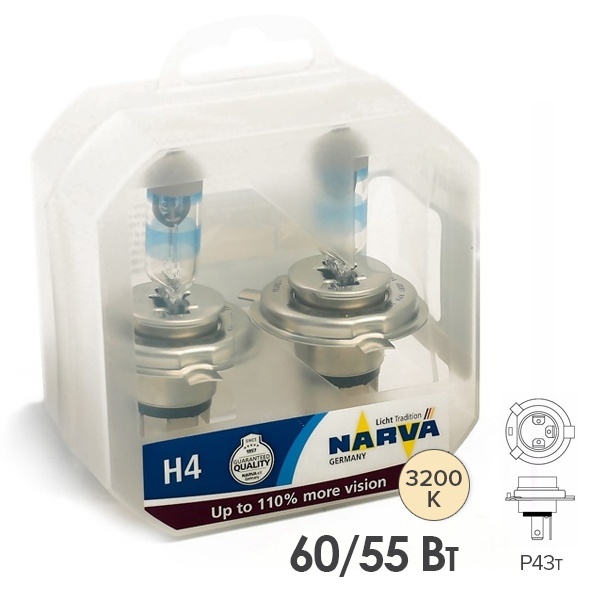Яркие галогенные лампы немецкого производителя Narva серии Range Power 110 с увеличенной яркостью на 110% обеспечивают хорошую освещенность и комфортное безопасное вождение. Они предназначены для ближнего и дальнего света фар легковых автомобилей с бортовым напряжением 12 Вольт. Номинальная мощность приборов с двумя спиралями составляет 55 и 60 Ватт для разных режимов работы. Они относятся к категории Н4 с цоколем Р43t. Световой луч от этих ламп длиннее, а излучаемый свет на 110% ярче по сравнению с требованиями, предусмотренными стандартом. Поэтому значительно увеличивается обзор, который позволяет реагировать на опасности на дороге быстрее. Цветовая температура устройств достигает 3200 Кельвинов. Они излучают комфортный для восприятия желто-белый свет. Для равномерного распределения света на дороге лампы следует заменять парами. Данные автолампы имеют одобрение ECE. В комплект входит 2 изделия, упакованные в пластиковый бокс.