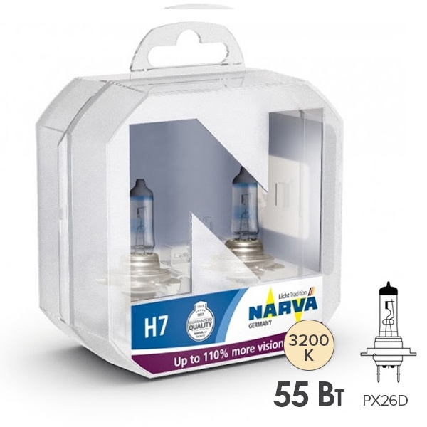 Современные галогенные лампы надежного немецкого производителя Narva линейки Range Power 110 с увеличенной яркостью на 110% обеспечивают хорошую освещенность на дороге и комфортное безопасное вождение. Они относятся к категории Н7 с цоколем PX26d и предназначены для ближнего и дальнего света фар легковых автомобилей с бортовым напряжением 12 Вольт. Номинальная мощность приборов составляет 55 Ватт. Световой луч от этих ламп длиннее, а излучаемый свет на 110% ярче по сравнению с требованиями, предусмотренными стандартом, поэтому значительно увеличивается обзор, что позволяет реагировать на опасности на дороге быстрее. Цветовая температура устройств достигает 3200 кельвинов. Они излучают комфортный желто-белый свет. Для равномерного распределения света на дороге лампы следует заменять парами. Источники света имеют одобрение ECE. В комплект входят 2 лампы, которые упакованы в пластиковый бокс. Упаковка надежно защищает содержимое от случайных повреждений в процессе хранения и транспортировки.