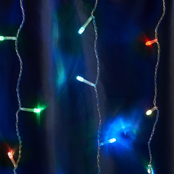 Гирлянда дождь FERON CL18, 160LED, (мультиколор), плавное изменение цвета, 1,5*1,5м+3м прозрачный шнур, расстояние между светодиодами 9,4см, IP44, 8W, от сети 230V, последовательное подключение до 5 гирлянд