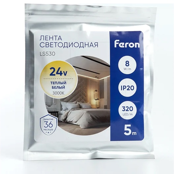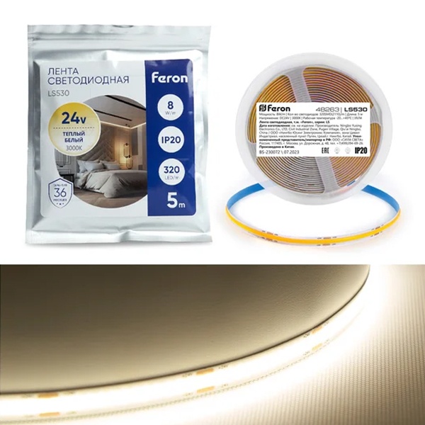 Светодиодная лента Ферон модели LS530 мощностью 10 Вт/м длиной 5 метров теплого белого света, напряжением 24 Вольта 48263