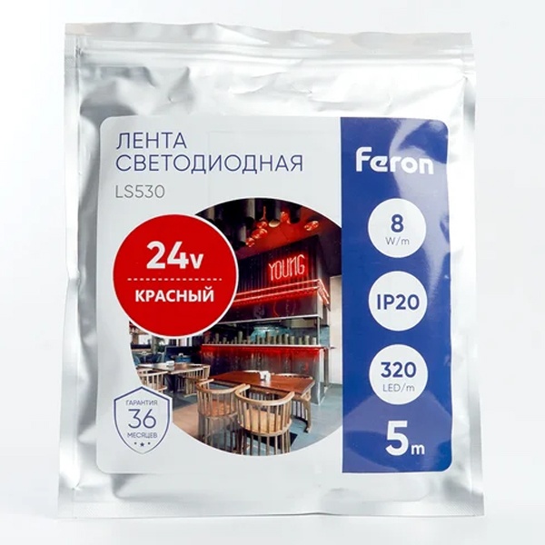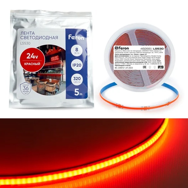 Лента светодиодная 24V FERON LS530, 320*COB, 8W/m, IP20, (красный), Кратность резки мм 45,5мм, 5000*8*1,80мм