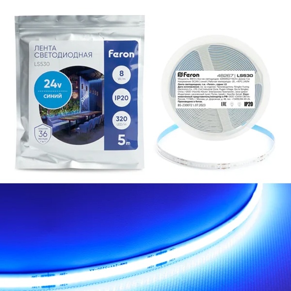 Лента светодиодная 24V FERON LS530, 320*COB, 8W/m, IP20, (синий), Кратность резки мм 49,7мм, 5000*8*1,80мм