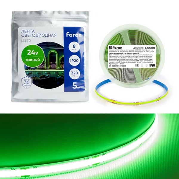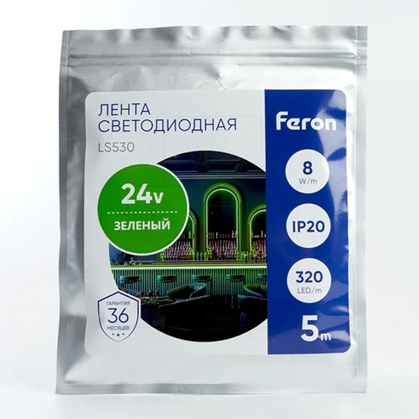 Лента светодиодная 24V FERON LS530, 320*COB, 8W/m, IP20, (зеленый), Кратность резки мм 49,7мм, 5000*8*1,80мм
