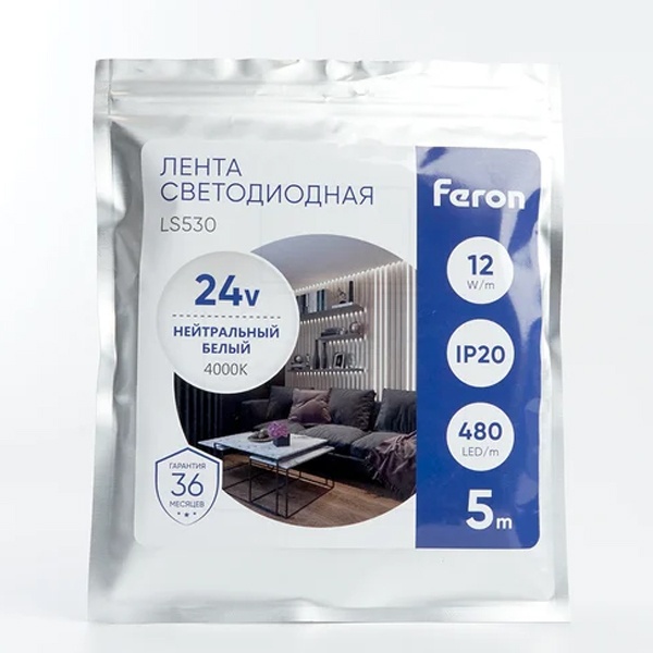 Светодиодная лента Ферон модели LS530 мощностью 12 Вт/м длиной 5 метров белого света, напряжением 24 Вольта 48271