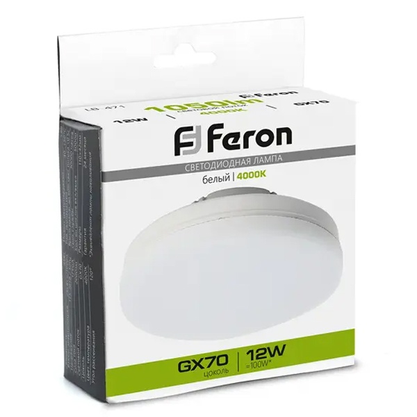 Лампа светодиодная FERON LB-471, GX70 (таблетка), 12W 230V GX70 4000К (белый), рассеиватель матовый белый, 1050Lm, угол рассеивания 120, 40*110мм