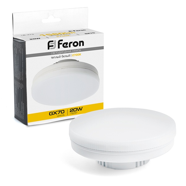 Лампа светодиодная FERON LB-473, GX70 (таблетка), 20W 230V GX70 2700К (белый теплый), рассеиватель матовый белый, 1560Lm, угол рассеивания 120, 40*110мм