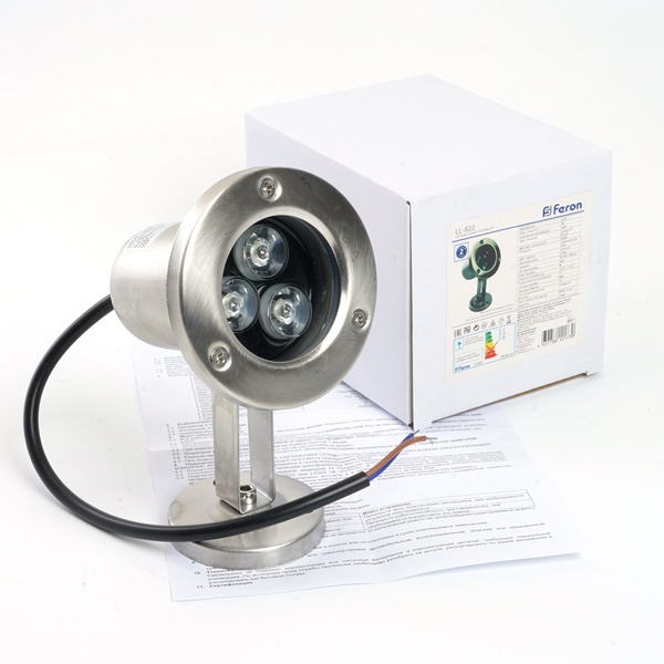 Подводный светильник LL-822, светодиодный, 3 LED, размер 130*80мм, длина провода 0,2м, материал корпуса нержавеющая сталь, цвет сечения теплый белый, напряжение AC24В, мощность 3Вт, класс защиты от поражения током - 3, степень пылевлагозащиты IP68, срок службы 50000 часов.